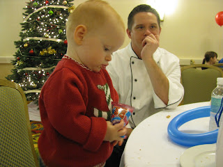 This was him on Christmas evening. He has decided that he can walk up and down the stairs just like big people. He's not so good at it, but he is good at making us laugh!!!
